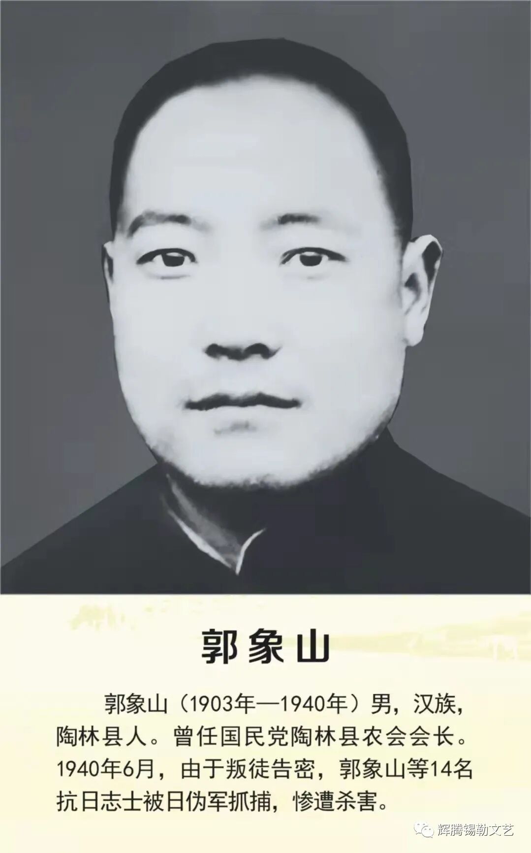 郭象山是陶林县人。在“七七”事变前就参加革命,秘密加入中国共产党。日军侵占陶林后,郭象山满怀拯救民族危亡的坚定理想,积极投身抗日。组织成立抗日救国会,刺探传递日伪军情,为八路军购买枪支弹药和药品布匹等。在陶林抗日战线上,他舍身忘死,彰显出共产党员的大无畏精神。