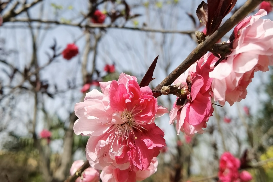农家桃杏尝鲜嫩,芳甸裙衫舞娜婀。