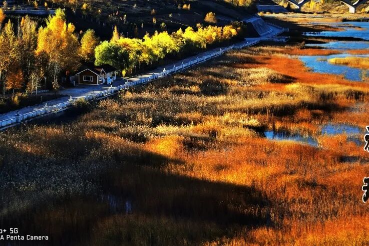 胡林尽染千山外,天地空悠。绿谷红流。叠翠铺黄满眼秋。