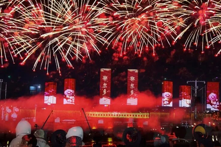 烟花鼓乐相交汇,龙跃狮腾万象妍。