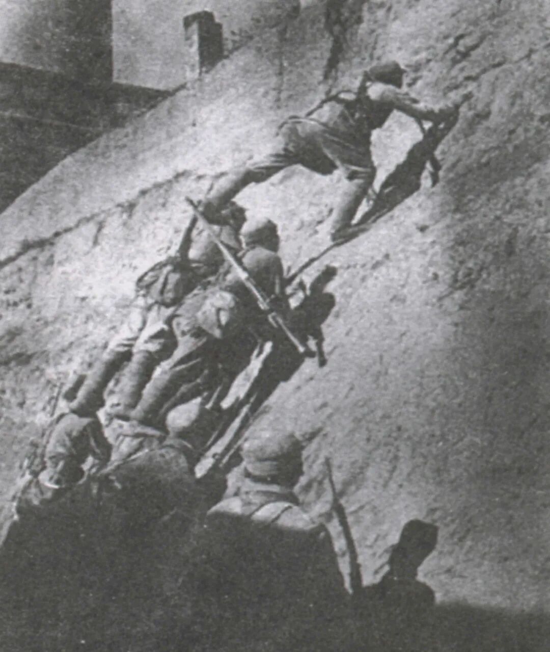 1940年夏,八路军大青山四支队战士搭起人梯,强攻三道沟敌据点,全歼日伪守敌