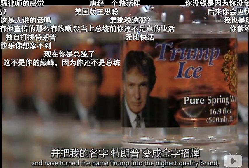 节目中大量TRUMP的标志不停的闪现。大到大厦,赌场和飞机,小到一瓶水都有醒目的TRUMP标志。