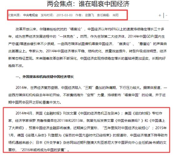 当年两会央视还做了“谁在唱衰中国经济”的专题
