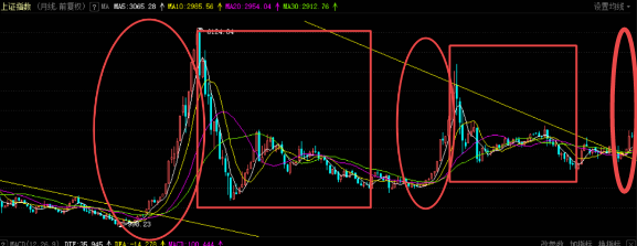 我们可以看看这张上证指数的月线图,椭圆区域的牛市和矩形区域的熊市把趋势走向展现的淋漓尽致。