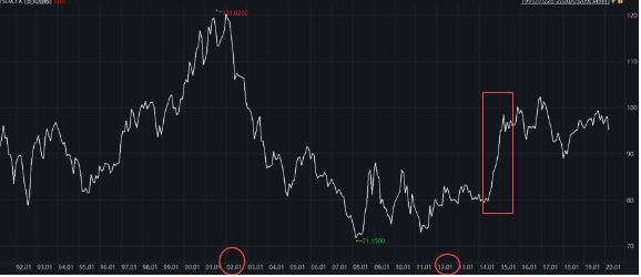通过40年周期表,我们可以看得非常清楚。美元指数基本是十年下降周期,六年上升周期。