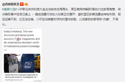 这两天更有意思的是川普。为了胜选居然撤换了邮政局长,据说是想操纵选票,让人大跌眼镜。