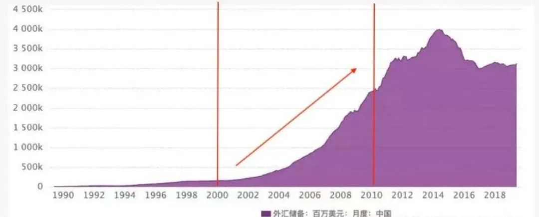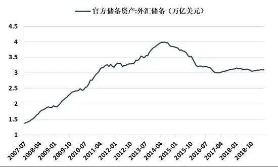 之后开始逐步企稳反弹,最终下降的趋势转为横盘,后面的外汇储备走成了一条直线,差不多一直维持在3万亿美元左右。