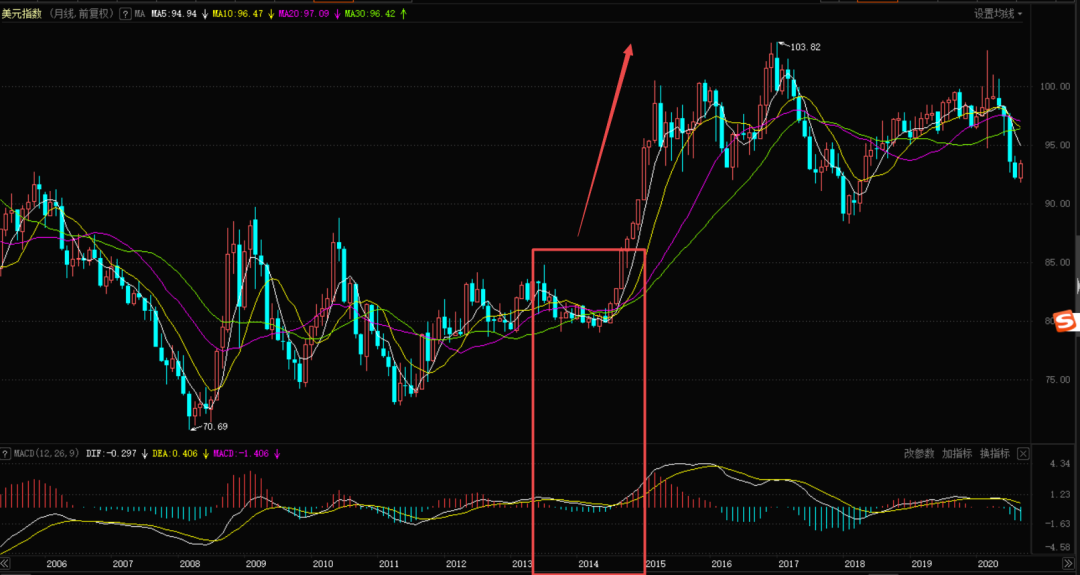 2014年下半年开始回流速度加快了,美元指数开始了一波快速上涨。到2015年初,美元指数从80涨到了100。
