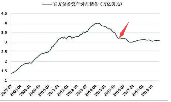 后面的一年多时间里,我们的外汇储备一路下滑,在2017年最低的时候曾经降到了不到3万亿美元。