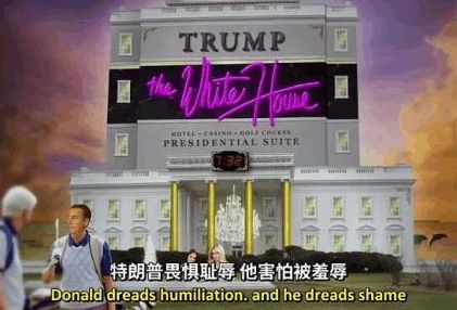 门口有比基尼美女和镶金的柱子,暗示川普不但将把他浮夸的生活方式带入白宫,还可能在其中提供不雅服务。