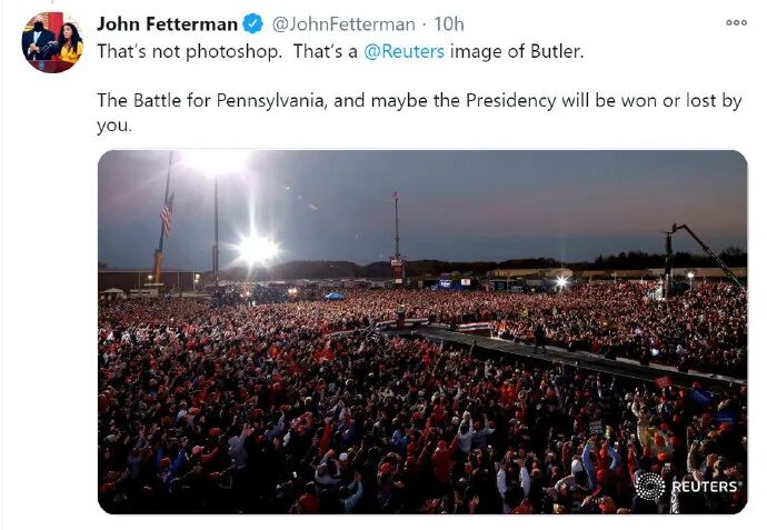 最近看到老川拉票那个群情汹涌,宾州的民主党州长John Fetterman甚至都有点急了。