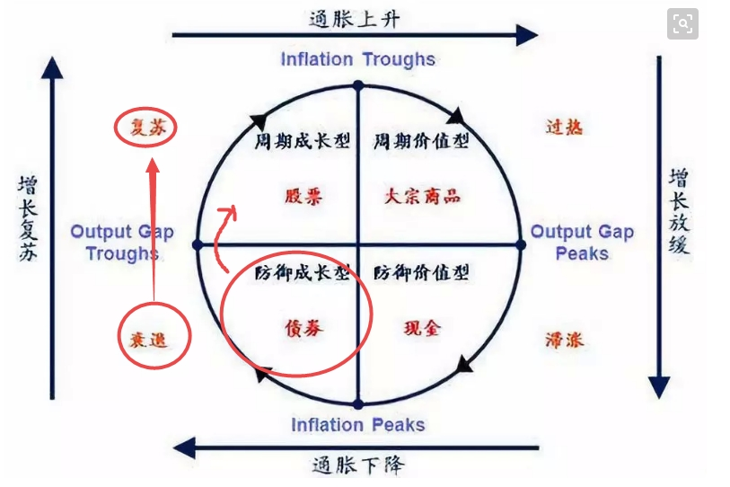 这一点我们在《经济开始复苏》里贴过的美林时钟上,可以清楚的看到,