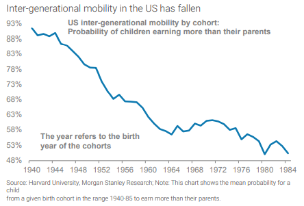 和底层劳动者一样倒霉的还有他们的孩子。随着社会阶层的固化,底层家庭孩子比父母赚得多的概率,越来越低。