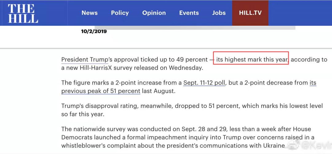 著名民调公司「Hill-HarrisX」最新民调显示,众院民主党对川普总统发起弹劾调查后,川普支持率不降反升为49%,是今年以来最高水平。