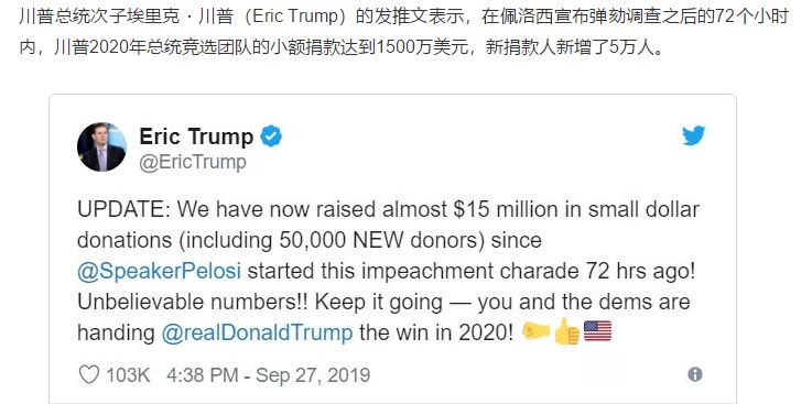 不光是支持率,在弹劾案之后,川普的捐款数也有明显上升,