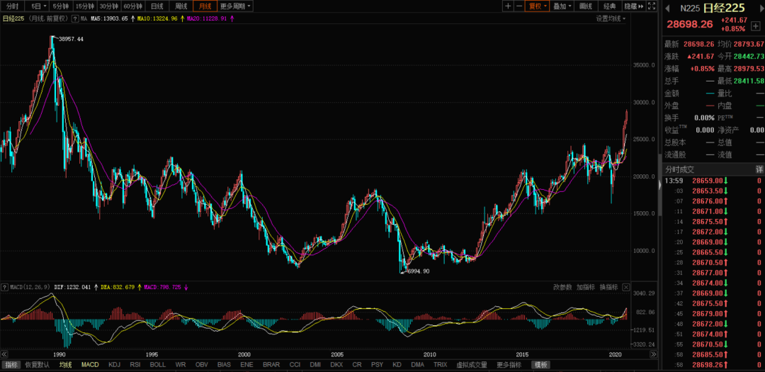 日经指数三月以来屡创新高,已经要奔着90年代那次泡沫高点去了。