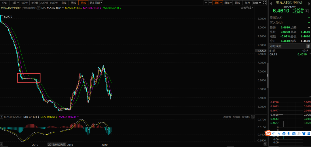 从下面这张人民币兑美元中间价走势,就能看出金融危机时候汇率的变化。