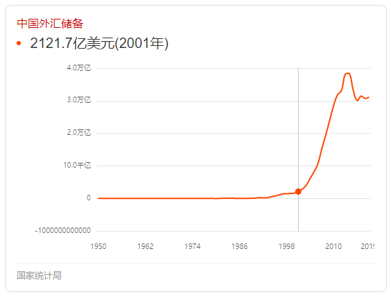 中国变身世界工厂之后,随着商品出口的不断增长,我们的外汇储备,也从01年开始不断攀升。