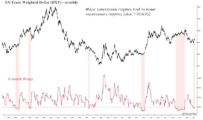 要知道美元指数过去六个月,都在窄幅波动。历史上出现这种情况,往往可能出现单边行情。