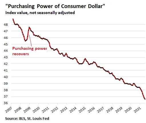 经历了2021年前7个月的大印钞,美元购买力7月份又下降了0.5%,换算成年率下降了8.6%。