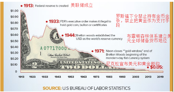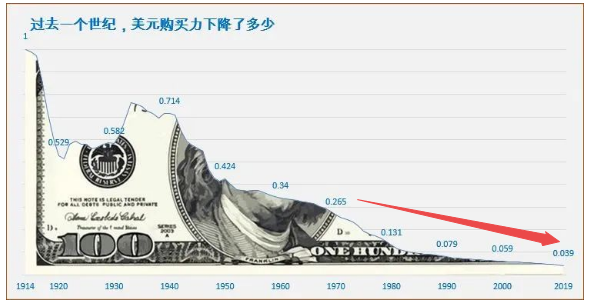 可以看出在1944年布雷顿森林体系以后,随着印钞不断增多,钞票的实际购买力是在加速下滑的。