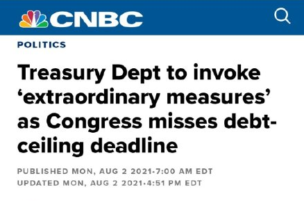 2021年8月1日开始,债务上限会重新生效,也就是白宫不能随便借钱了。
