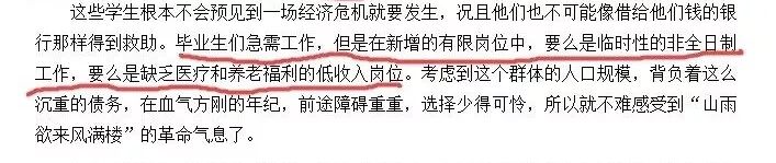 多数普通美国人目前面临的就是这样的困境,一毕业就背着一屁股债务,他们急需工作来还债,在血气方刚的年纪,选择少的可怜,前途障碍重重,这一切迫使他们走上了“占领华尔街”的活动来表达自己的不满。