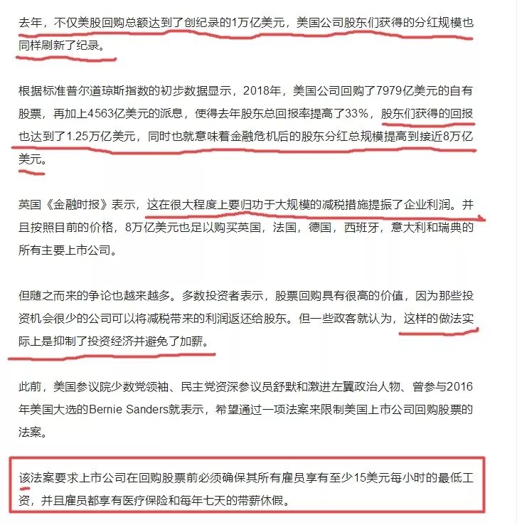 后面政客们都看不下去了,要求通过法案限制公司回购股票,法案要求公司回购股票之前所有雇员享有15美元每小时最低工资、医疗保险和每年七天的带薪休假。