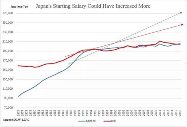 很典型的例子就是,在过去二十年,不管是应届生的起薪还是日本人的年收入,都没啥大的变化。