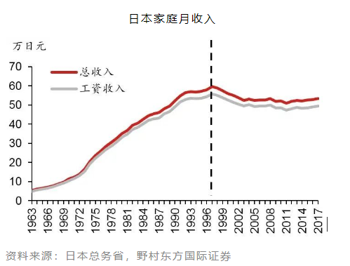同样在1995年,日本的生育率跌破警戒线以后。家庭月收入和人均GDP增速一样,也开始高位横盘。