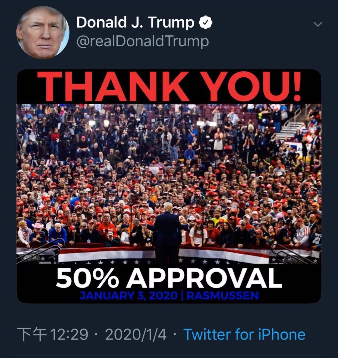斩首苏莱曼尼另外的收获是,连任的民调支持率迅速超过50%,达到历史最高,再没人关心那个所谓弹劾。