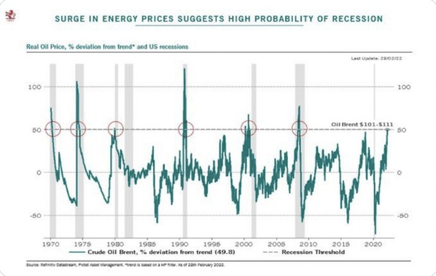 但是从1970年代以来,每次油价飙升50%以后,随后在一年半载的时间内,就是美国经济的大幅衰退。