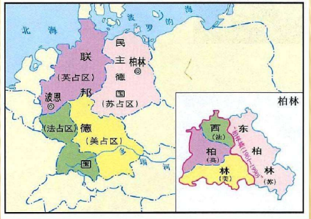 东西柏林就是这个时候产生的,等于说德国一边被英美为首的西方国家控制,一边被苏联控制。