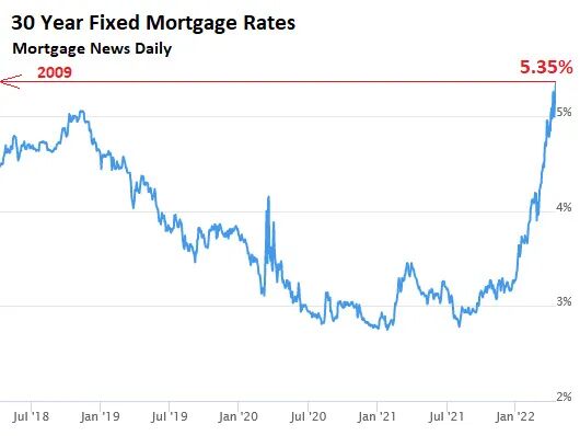 目前美国那边30年住房抵押贷款的利率,已经从不到3%上升到5.35%,这个数字已经超过了2009年的高点。