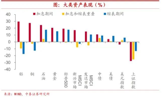 按照中泰证券过往研报的统计数据,在这轮加息缩表持续三年的时间里,各类资产的表现是大不同的。