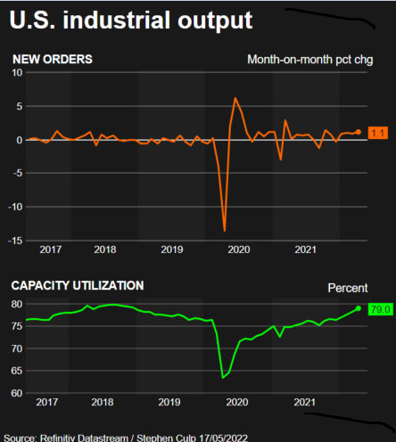 从产能利用率的角度看,老美那边3月份的产能利用率,已经高达78.3%。