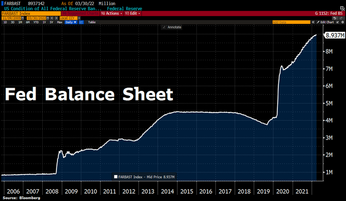 很典型的例子就是在2020年新冠疫情爆发以后,在无限量化宽松背景下,那根直线上升的美联储资产负债表数值。