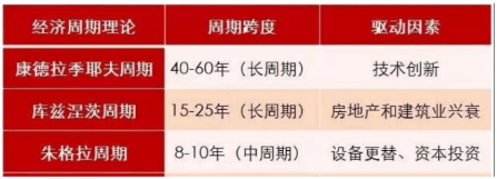 分别是40-60年的康波理论,以及15-25年的库兹涅茨周期理论,和8-10年的朱格拉周期理论,。