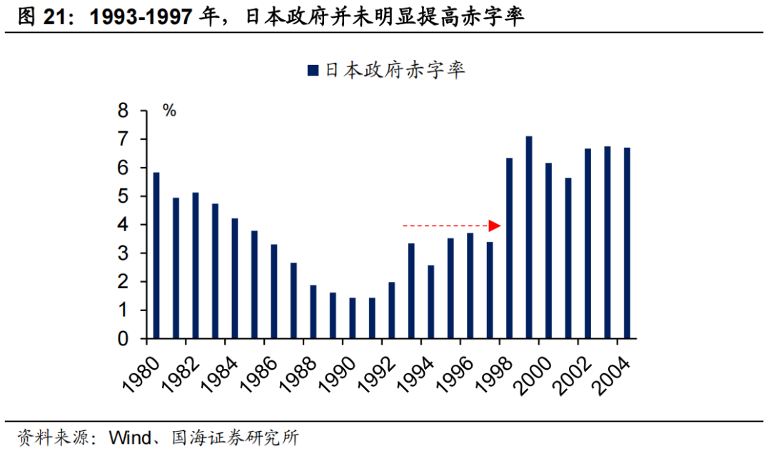 很典型的例子就是,如果我们观察1993年至1997年,会发现日本政府赤字率为3.5%左右,甚至低于80年代的赤字率规模。