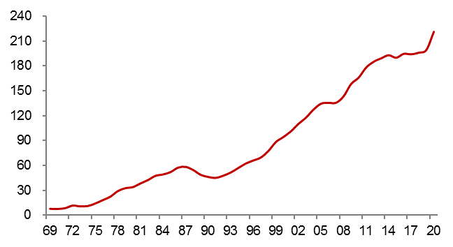 带来的直接结果就是日本的公共债务/GDP高达266%,几乎是全世界最高,财政收入的三成都在还本付息。