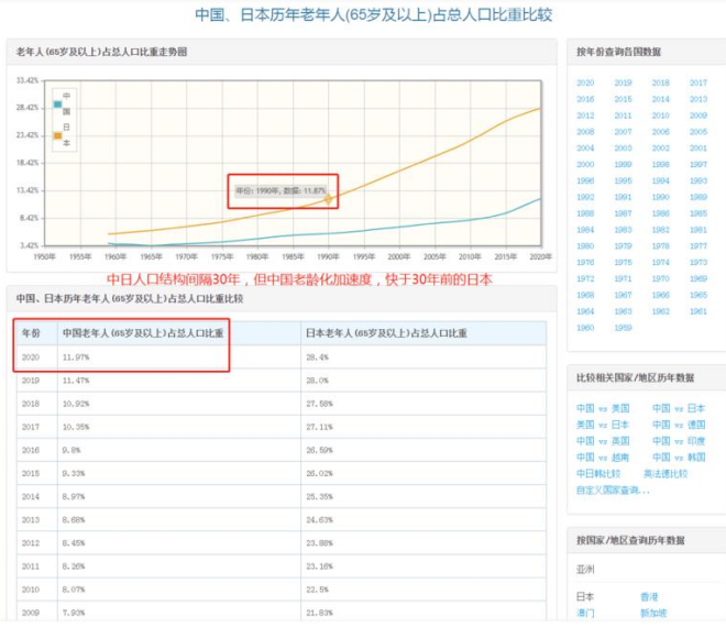 为啥说我们会加速步入老龄化呢?因为如果从统计上看中国和日本人口结构的话,大概差了30年左右的样子。