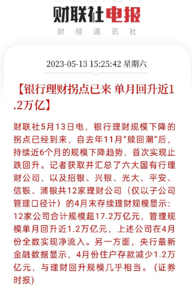 这是从2022年11月理财赎回潮之后,持续6个月的银行理财规模下降,首次实现了止跌回升。