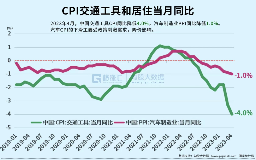 可以看到2023年4月不管是交通工具CPI还是汽车制造业的PPI,都是同步下滑的,这侧面反应了购车的需求不足。