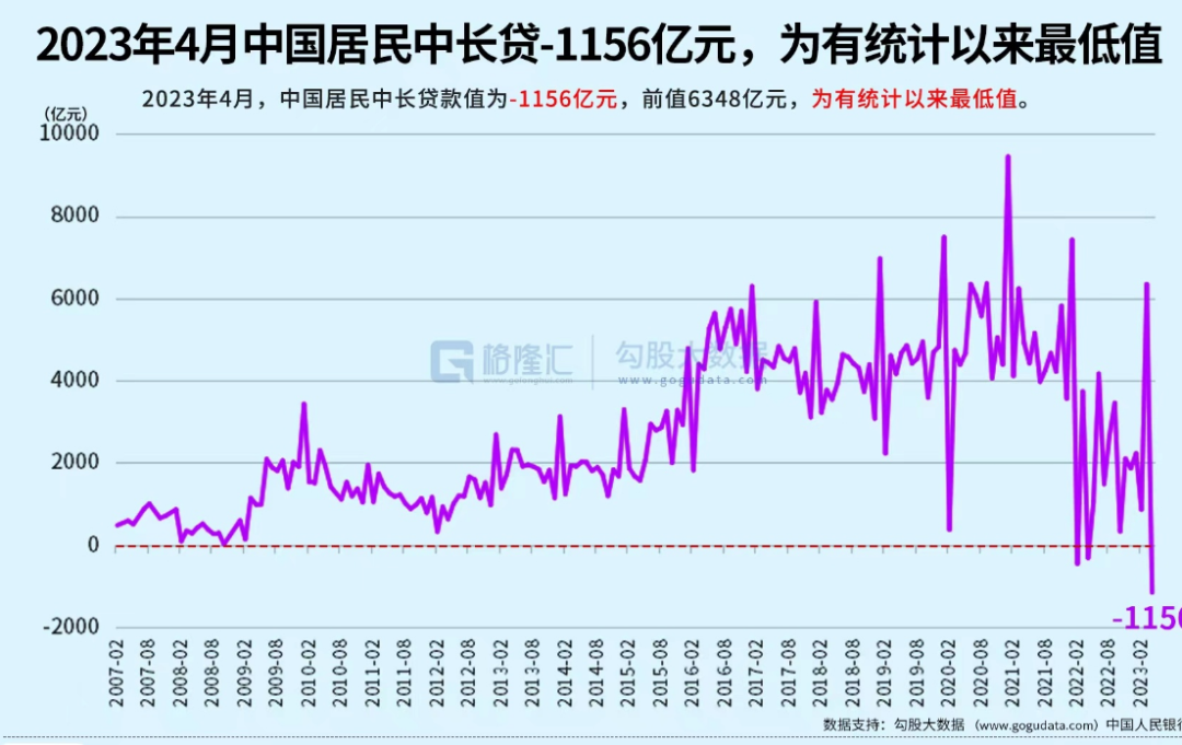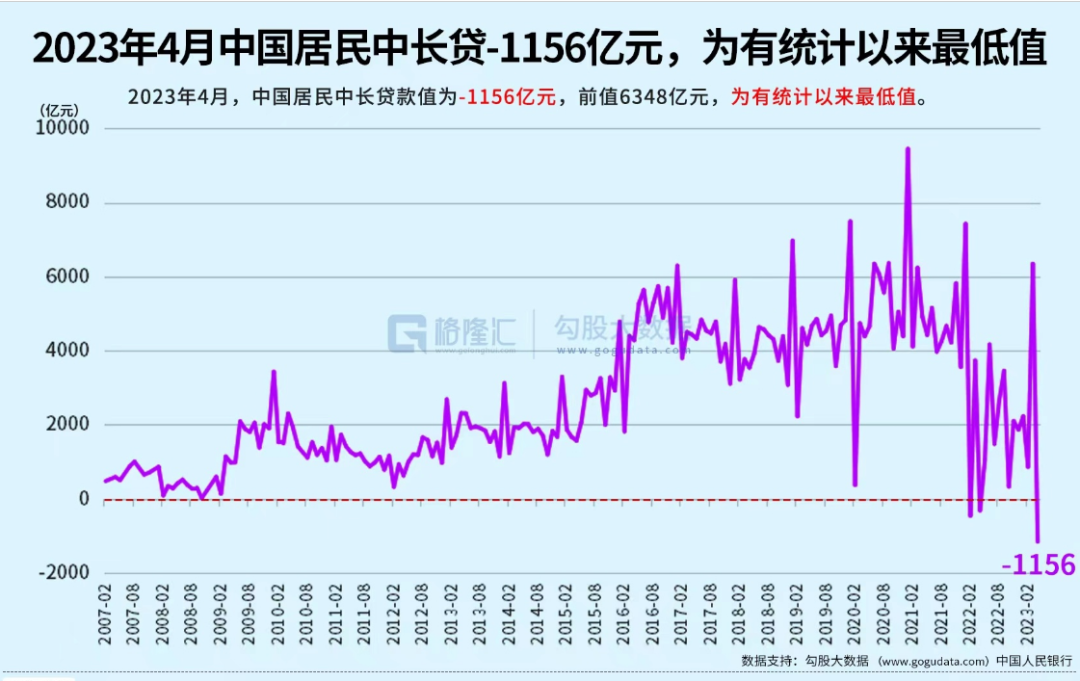 如果我们看房子这部分的话,2023年4月居民的中长贷是-1156亿元,这是有统计以来的最低值。