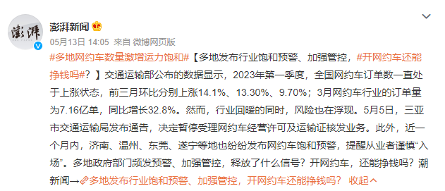 前两天看到个消息还挺有意思的,说很多地方的网约车数量激增,导致运力出现饱和。