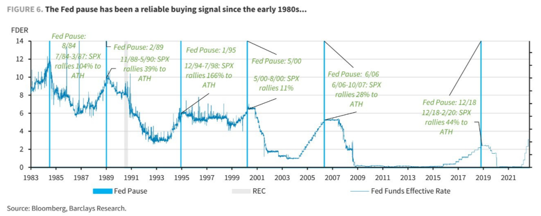 如果再观察历史上美联储暂停加息后,标普500指数随后一年左右的表现,也能得出类似的结论。