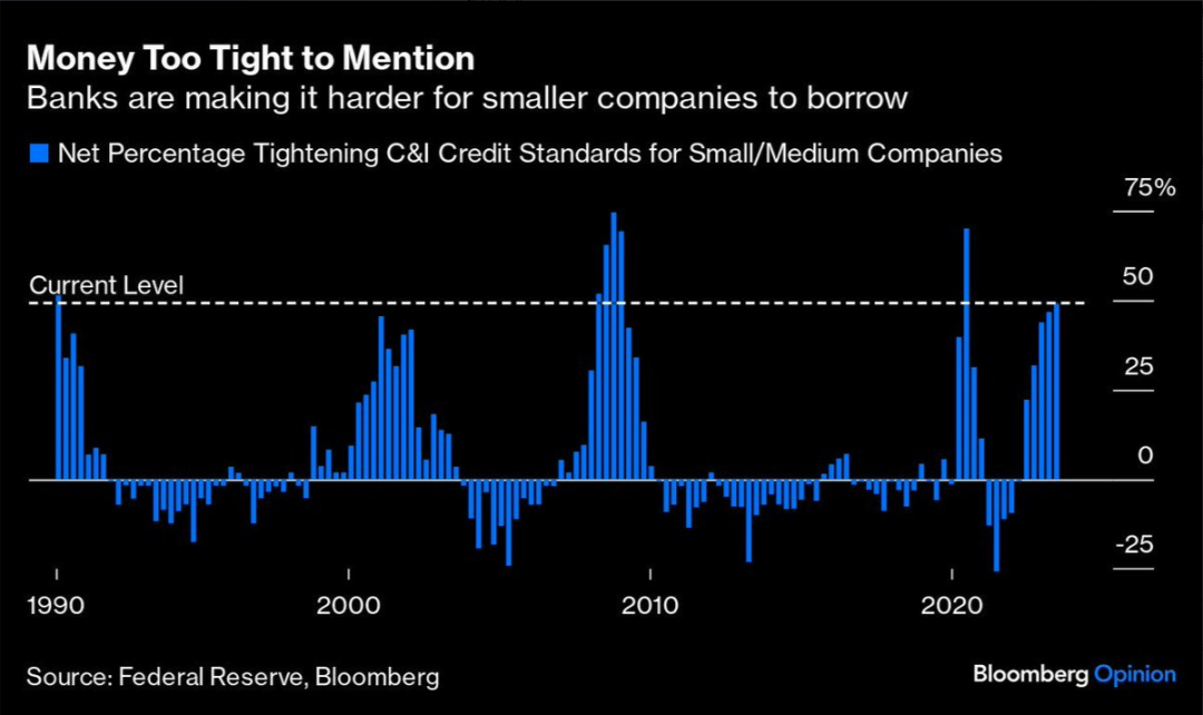 最近我们也可以看到,美国银行在联储加息之后,大幅收紧了对中小企业的贷款,这会抑制需求的同时提高失业率。