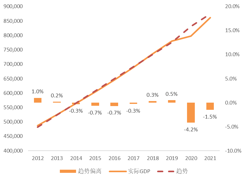 前段时间有小伙伴问了个有意思的问题,说前几天看到一张挺久之前的数据图,发现目前实际GDP增长已经偏离了趋势线。
