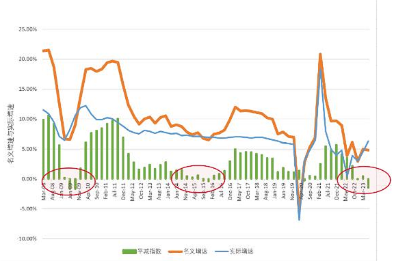 所以平减指数能够更加准确地反映一般物价水平走向,是对价格水平最宏观测量,也反映了实际经济增长率与名义增长率之间的差异。