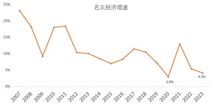 但是要注意的是:23年的名义经济增速是在4.2%的位置,弱于2022年的5.4%。
